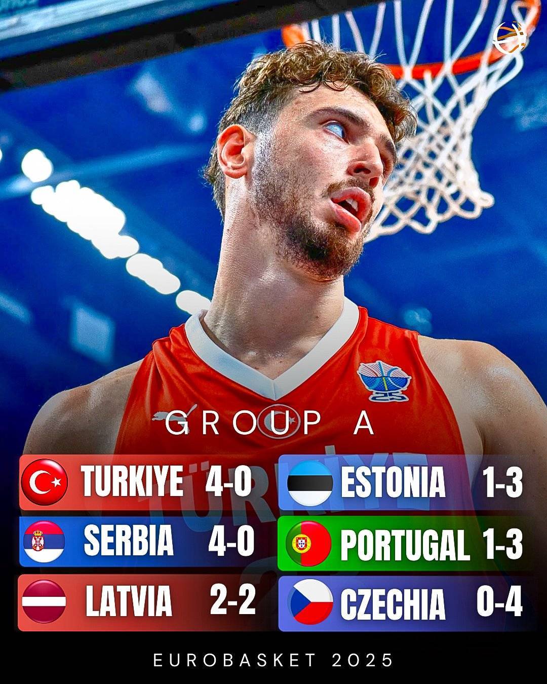 A组方面,塞尔维亚和土耳其均已4胜0负的战绩提前晋级16强,而捷克则惨遭淘汰。由于拉脱维亚也已提前出线,爱沙尼亚和葡萄牙去争夺最后一个晋级资格。